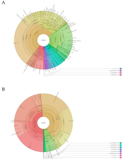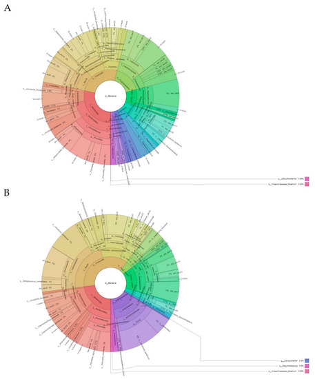 Representation created using the Krona hierarchical browser of the phylotypes identified at the phylum, class, order, family, genus, and species level in an individual with periodontitis: (A) Baseline subgingival sample; (B) Subgingival sample compatible with gingival health after antibiotic therapy.