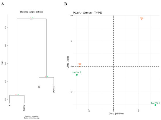 Characteristics of the clusters of samples: (A) Identified clusters of the taxa of the saliva and subgingival plaque samples at baseline and post-therapy; (B) principal coordinates analysis (PCoA) with weighted UniFrac distances of the samples by cluster assignment. S1, baseline subgingival sample; S2, post-therapy subgingival sample; Saliva 1, baseline saliva sample; Saliva 2, post-therapy saliva sample.