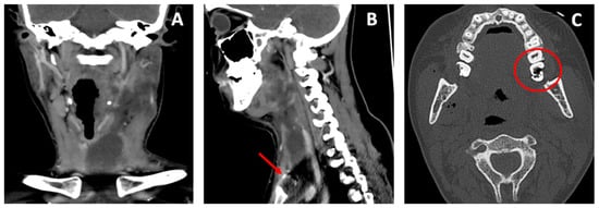 Herein, we present the case of a 28-year-old woman admitted to our emergency department presenting with left submandibular swelling that had arisen five days earlier, and was associated with a fever, progressive dysphagia, trismus and dyspnea. The ENT examination revealed a painful left submandibular swelling covered with hyperemic and warm skin. The endoscopy of the upper airway tract showed swelling on the left side of the oropharynx and hypopharynx, and a mobility impairment of the left vocal fold. The head–neck computed tomography (CT) scan performed with and without a contrast agent showed a voluminous mass involving the left submandibular region, perimandibular soft tissues, masseter muscle, tonsillar region and the parapharyngeal space, resulting in the aerial column deviating to the right. The swelling caused the compression of the internal jugular vein and extended up to the anterior mediastinum, behind the sternal manubrium (Figure 1A,B).