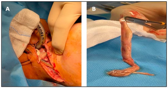 The patient was transferred at the ENT ward and was given antibiotics (2.2 g IV (intravenous) amoxicillin every 8 h and 600 mg IV clindamycin every 6 h) and corticosteroid therapy (4 mg IV betamethasone every 12 h). We planned a double approach: an intraoral access—removing the teeth that probably caused the infection—and an extraoral one—performing a surgical drainage of the abscess in the neck. In detail, the oral surgeon realized a full thickness flap through a buccal and lingual incision of the oral soft tissue from element 3.4 up to element 3.8; he then performed the avulsion of elements 3.6 and 3.7, and, finally, through osteotomy, the extraction of element 3.8. Subsequently, the ENT specialist performed a left Paul-Andre neck incision to open the submandibular lodge and the laterocervical space. After the drainage of the deep space of the neck, we found a membrane containing the purulent material originating from the tooth roots of element 3.8, which stretched up from the submandibular and laterocervical region to the mediastinum, measuring 13 cm (Figure 2A,B).