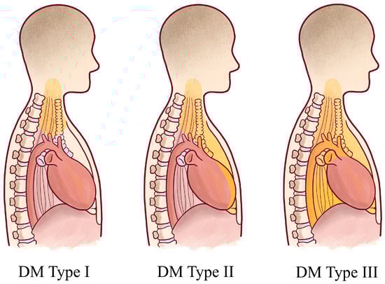 Descending mediastinitis (DM) classifications. The grey area indicates the extension of infections. Type I: DM is localized in the upper mediastinum above the tracheal bifurcation. Type II: DM extends to the lower anterior mediastinum. Type III: DM extends to the anterior and lower posterior mediastinum.