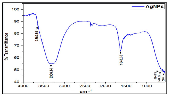 The Fourier Transform Infra-Red (FT-IR) spectrum of the prepared AgNPs was recorded to determine the presence of functional groups. The characteristic IR absorption major broad peak at νmax 3356.14 cm−1 accounted for the presence of OH, and the sharp peak at 1643.35 cm−1 attributed to the carbonyl (-C=O) stretching, together with minor peaks at 2350.06, 624.93, and 594.07 cm−1, which agreed with the absorption values of the previous studies on the citrate-capped AgNPs characterization [7,29] (Figure 2). Moreover, the AgNPs IR spectrum differed from the starting material, silver nitrate, which exhibits a characteristically strong metal nitrate peak and is devoid of the hydroxyl function peaks. The AgNPs spectrum also differed with the SDS and TSC, the emulsifier and capping agent used in the synthesis, respectively. The synthesis of the AgNPs was also confirmed by other analyses and morphological observations.