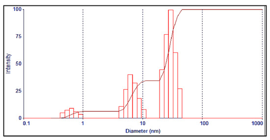To further analyze the size and its distributions, as well as the morphology of the synthesized AgNPs, a 77,500× magnification was used for TEM analysis. The TEM demonstrated that most of the prepared AgNPs have small spherical shapes with an average mean size of 26.531 nm, as also exhibited in the histogram. Then, ImageJ software (Java 1.8.0, Gaithersburg, MD, USA) was used to determine the particles’ diameters (Figure 6).
