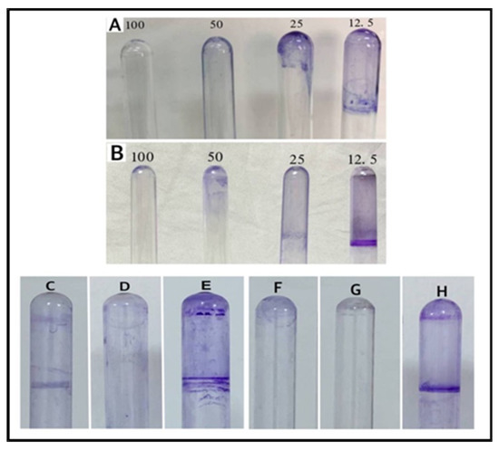 The biofilm formation was detected before and after the treatments with AgNPs (100, 50, 25, and 12.5 μg/mL), lincomycin alone (15 µg/mL), and an AgNPs–lincomycin mixture [20]. In test tubes, a loop-full of test isolates were inoculated in 5 mL of tryptone soya broth, and for 24 h the tubes were incubated at 37 °C, later decanted, washed with phosphate buffer saline (pH 7.4) and left to dry. The tubes were stained with crystal violet, excess stains were washed with deionized water, and the tubes were dried upside down.