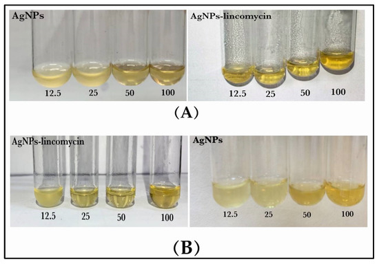 MIC and MBC of the AgNPs and AgNPs–lincomycin against bacterial isolate: (A) B. cereus and (B) P. mirabilis.