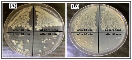AgNPs’ (100 µg/mL) activity against growths of B. cereus and P. mirabilis was determined [23]. The 0.1 mL of AgNPs and 0.1 mL of bacterial suspensions were added to 10 mL of nutrient broth, and 0.1 mL was spread on the Mueller–Hinton agar plate, incubated at 37 °C for 24 h, and the viable bacterial cells were observed at 0, 30, 60, and 90 min intervals.