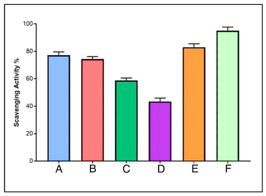 Anti-oxidant potentials of AgNPs at different concentrations (A. 100, B. 50, C. 25, and D. 12.5 μg /mL), E. AgNPs–lincomycin mixture, and F. ascorbic acid.