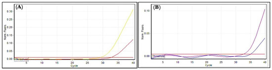 Gene expressions: (A) Bla gene; (B) BlaCTX-M-15. Amplification plots by qPCR samples before and after treatment with AgNPs. The picture was taken directly from the Cepheid (smart cycler) qPCR.