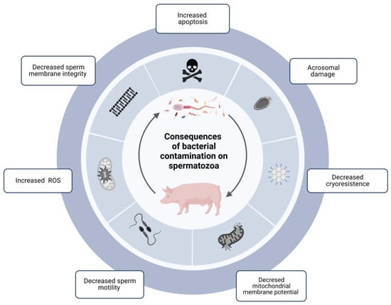 The degree of bacterial contamination in ejaculates directly influences sperm quality parameters during cold preservation (Figure 1) [28]. Many studies have exemplified the consequences of bacterial growth on spermatozoa, which are summarized in Table 1.