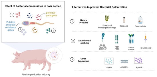 Boar semen contain a large bacterial community, including potential pathogens and putative antibiotic resistance genes. For this reason, different supplements have been evaluated that could contribute to decreasing the bacterial load in semen and maintaining quality parameters under freezing conditions and subsequent use in the industry. Within this group, we find natural molecules, antimicrobial peptides, and other supplements. Proline-arginine-rich antimicrobial peptides PR-39 (PR-39), porcine myeloid antimicrobial peptides 36 (PMAP-36), and 37 (PMAP-37), synthetic cyclic hexapeptides (c-WFW, c-WWW), pegylated single-walled carbon nanotubes (pSWCNTs), and magnetic silver nanocomposites (Ag-MNP). Created with BioRender.com.