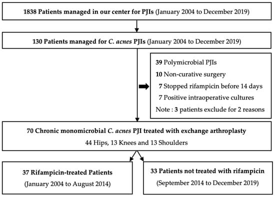 Finally, 70 patients with chronic monomicrobial Ca-PJIs of the hip, knee, or shoulder, who underwent exchange arthroplasty, were included in the study. Thirty-seven patients received rifampicin-combination therapy and thirty-three were given monotherapy without rifampicin (Figure 1).