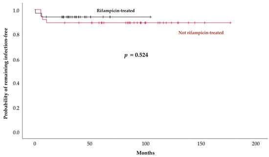 The Kaplan–Meier estimated 2-year reinfection-free probability did not differ between rifampicin recipients (89.2% [+/−0.05]) and patients not treated with rifampicin (93.8% [+/−0.04]) (p = 0.524) (Figure 2).