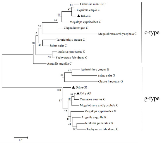 Furthermore, a phylogenetic tree was constructed based on the amino acid sequences of DrLysC, DrLysG1, DrLysG2 and their homologs in fishes (Figure 1). Fish lysozymes were clustered into two distinct branches, i.e., c-type and g-type [22]. DrLysC was clustered with Cypriniformes, Elopiformes, and Clupeiformes, while DrLysG1 showed the closest genetic distance with Cypriniformes then other fishes such as Anguilliformes, Elopiformes, Siluriformes, and Siluriformes. Moreover, only a few g2-type lysozymes were identified, so DrLysG2 was clustered into a separate branch.