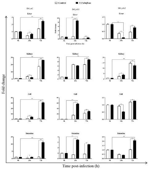 The expression of DrLysC, DrLysG1, and DrLysG2 in different tissues of V. vulnificus-infected zebrafish. Tissues of V. vulnificus-infected zebrafishes were collected at 0, 24, and 72 h post injection, and total RNA was extracted for qPCR analysis. Relative expression of DrLysC, DrLysG1, and DrLysG2 was calculated using the 2−∆∆Ct method, and data are expressed as fold-change values. Each sample was tested in triplicate, and all data are presented as means ± SD. Statistical analysis was determined using two-way ANOVA for multiple comparisons. ** indicates highly significant differences (p < 0.001); * indicates significant differences (p < 0.05).