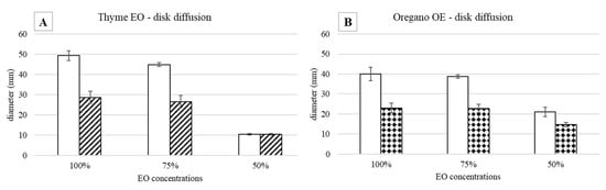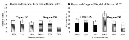 Agar diffusion test against E. coli incubated at 28 °C (A) and 37 °C (B): halo diameters measured after 48 h of incubation in the presence of thyme EO (oblique striped and black bars) and oregano EO (horizontal striped and checked bars). The white top portions of the bars represent the zones of faint bacterial growth.
