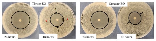As regards the thyme EO, it was able to influence bacterial growth at all the tested concentrations (Figure 1A). Looking at the changes of the halo diameters between 24 and 48 h of incubation, it is possible to observe that for the highest EO concentrations, the diameters decreased in a similar way, namely 41.9% for 100% EO and 40.9% for 75% EO, reaching, at the end of the incubation period comparable values, 28.6 mm and 26.5 mm respectively, which was not proportional to the EO concentration. On the contrary, in the presence of 50% EO, the diameter remained unchanged, i.e., equal to 10.4 mm, a value significantly lower with respect to that measured with the highest concentrations. Concerning the oregano EO, all the three concentrations allowed to measure inhibition halos, which varied between 24 and 48 h of incubation (Figure 1B). As observed for thyme EO, the effect due to 100% and 75% EO was very similar, and the respective diameters diminished by about the same percentage, namely 42.5% and 41.3%, reaching at 48 h 23 mm and 22.7 mm, respectively. In the case of oregano EO, for the 50% concentration, a decrease in halo diameter (30%) was also observed: at 48 h of incubation, the value was 14.7 mm. As an example, in Figure 2, it is possible to observe the decrease of the halo diameter in the presence of 100% thyme and oregano EOs.