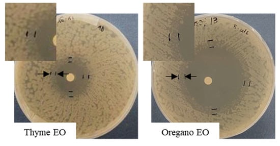 Thyme and oregano EOs are well-known for their antimicrobial efficacy due to their carvacrol and thymol constituents [9,11]. In the present work, as it has been reported, the same MIC value was obtained with thyme EO against both the bacteria. On the contrary, at the tested concentrations, an MIC was not identified for oregano EO. In any case, both EOs were applied in the following specific antimicrobial tests, i.e., disk diffusion and disk volatilization, because the EO activity can vary depending on the application modality, namely in the liquid or in the vapor phase.