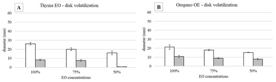 Disk volatilization test against S. epidermidis incubated at 37 °C: halo diameters measured after 24 (white bars) and 48 (grey bars) h of incubation in the presence of (A) thyme and (B) oregano EO (3 µL).