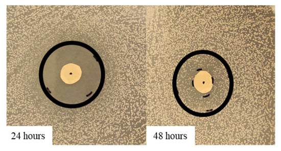 As previously reported for disk diffusion tests, also in this case, between 24 and 48 h of incubation, a progressive reduction of the inhibition zone was observed.