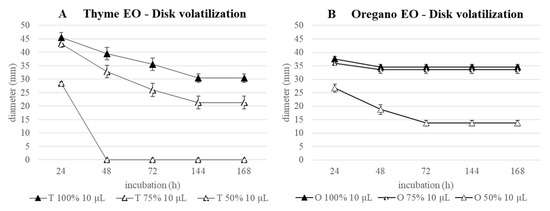 As regards the thyme EO, at the two highest concentrations, a progressive halo reduction was measured until the 144th h, and then, stabilization of the inhibition was registered until the 168th hour (Figure 7A). At the end of the incubation, haloes were still high; in particular, that of 100% EO, i.e., 30.4 mm, was comparable to that obtained with 75% after 48 h (32.8 mm). Conversely, the 50% EO resulted as efficacious only in the first 24 h of treatment.