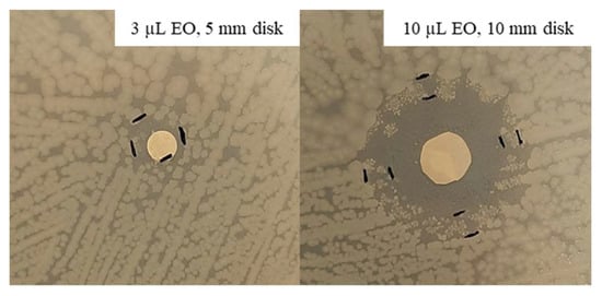The disk volatilization assay was set up to test the antibacterial efficacy of the two EOs in vapor phase. To this purpose, a single filter paper disk was attached to the lid of the Petri dish by means of a bi-adhesive tape. Used disks had a diameter of 5 or 10 mm and were soaked, respectively, with 3 µL or 10 µL of 100, 75, or 50% EO or 1.5% TEGO. The obtained ratio “EO volume/disk area” were similar and, respectively, equal to 0.13 and 0.15 µLEO/mm2. An amount of 100 µL of 1.0 × 105 CFU/mL bacterial suspension was spread over the surface of Mueller–Hinton agar. Once set up, Petri dishes sealed with Parafilm® (Neenah, WI, USA) M and enveloped with PVC film were incubated inverted on top of the lid.