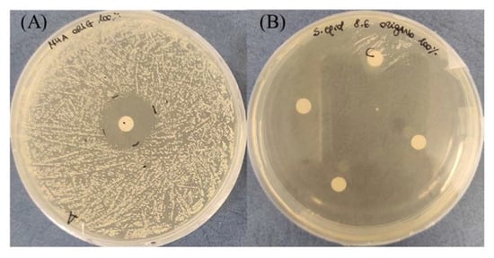 After 24 and 48 h of incubation, the inhibition zones on the agar surface below the imbibed paper disk were measured at the two perpendicular diameters at the point of complete inhibition as judged by the naked eye, Figure 11B. In some experiments, as indicated in the Results section, diameter measurements were carried out until the 168th h of incubation. Each trial was conducted in triplicate.