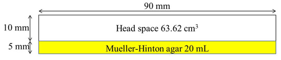 In all the antibacterial tests, the inoculum was prepared using the direct colony suspension method. Three colonies, coming from a 24 h old culture grown on solid medium, were withdrawn and suspended into 5 mL of 0.85% NaCl to obtain a cell density equal to 1 × 108 CFU/mL; this last density was further diluted, using the same saline solution, to reach the final concentration of 1 × 105 CFU/mL. All the tests were performed in 90 mm Ø Petri dishes (Polystyrene, PS) filled with 20 mL of Mueller–Hinton agar, giving a 10 mm high head space corresponding to a free volume of 63.62 cm3 (Figure 10).