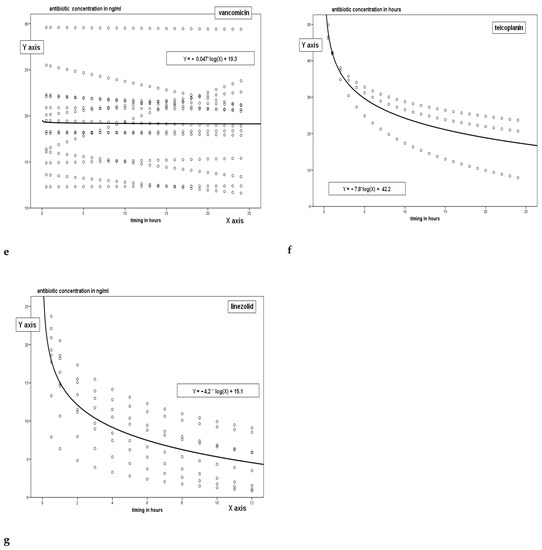 Figure 1a–g shows the pharmacokinetic curves obtained for each class of antibiotic; the trend is related to time and particularly since the peak concentration, measured after half an hour since the drug administration up to the time immediately before the following administration of the antimicrobial. The trend of the single antimicrobial concentrations can be interpreted by a logarithmic regression curve whose specific equation is shown in the figures.