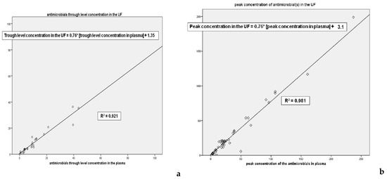 Figure 3a,b show the linear regression between the concentration of the drug in UF and plasma; values are presented for both trough level and peak concentration; the relation between the drug concentrations in the two fluids is very close, confirmed by the R2 presented in the figures. The higher is the plasma concentration of the antimicrobials the higher is the UF one.