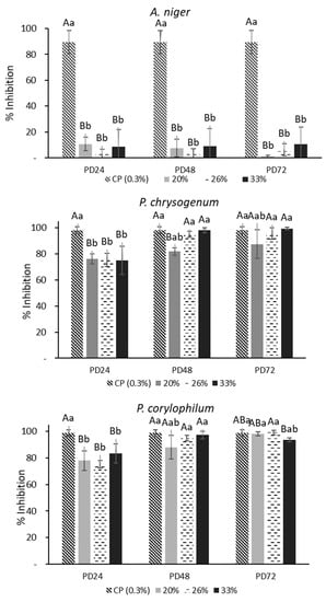 Percentage of inhibition (plate counts) of aqueous extracts (AEs) obtained from the poolish-type dough (PD) fermented with Lactiplantibacillus plantarum NRRL B-4496 for 24, 48, and 72 h at three concentrations and calcium propionate (CP). Different capital letters show significant differences (p < 0.05) with respect to the fermentation time. Lowercase letters indicate significant differences (p < 0.05) with respect to the concentration of AEs at the same fermentation time.
