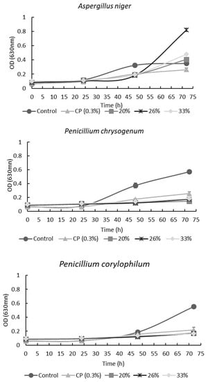 Figure 2 shows the effect of PD48 extract on mold growth measured by optical density. For A. niger, all AE concentrations increased the lag phase. However, after 72 h of incubation, the OD for all concentrations was higher than the control and CP. This phenomenon is probably due to the higher content of reducing sugars in the extract that molds can use as a carbon source. In contrast, the concentration of the antimicrobial compounds was not enough to inhibit mold growth [9].