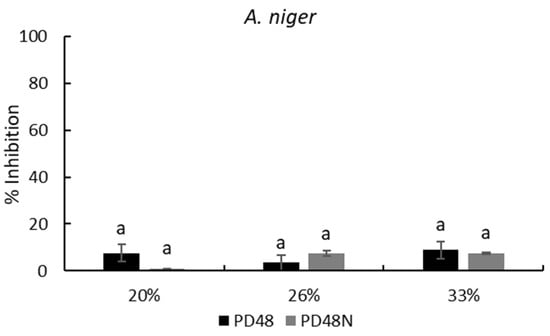 On the other hand, the neutralized AE maintained its inhibitory capability against the tested molds. Figure 3 exhibits the mold inhibition at three concentrations of neutralized AE (PD48N) which are similar (p > 0.05) to native AEs for A. niger and P. corylophilum; only the neutralized AE at 20% (PD48N) on P. chrysogenum presented a significant high inhibition (p < 0.05) compared with native AE (PD48) at the same concentration. The neutralized AEs treated with proteinase K lost their antifungal capacity against all the molds analyzed. Similar findings were reported by Arrioja-Bretón et al. [17] for CFS obtained from Lactiplantibacillus plantarum NRRL B-4496 cultivated in MRS broth, which maintained its antimicrobial activity against pathogenic bacteria after CFS was neutralized at pH 6.5. Moreover, fractionated CFS from Lactiplantibacillus plantarum NRRL B-4496 grown in MRS broth showed antimicrobial protein compounds against Listeria monocytogenes Scott A [26]; thus, antifungal protein/polypeptide compounds are likely present in the AE. Likewise, Rizzello et al. [13] observed the antifungal activity of methanol and water/salt-soluble extracts obtained from the fermentation of wheat germ with L. plantarum LB1 and L. rossiae LB5 against various molds isolated from bread. They reported that the antifungal activity was due to the synergistic and complex activity between the organic acids and peptide compounds formed during the lactic acid fermentation of the two lactobacilli. Further research should be performed to identify the antifungal compound in this work.