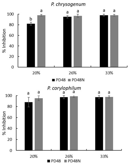 Percentage of inhibition (plate counts) of native (PD48) or neutralized (PD48N) aqueous extracts (AEs) obtained from the sourdough fermented with Lactiplantibacillus plantarum NRRL B-4496 after 48 h at three concentrations. Different lowercase letters indicate significant differences (p < 0.05) with respect to native or neutralized AEs.