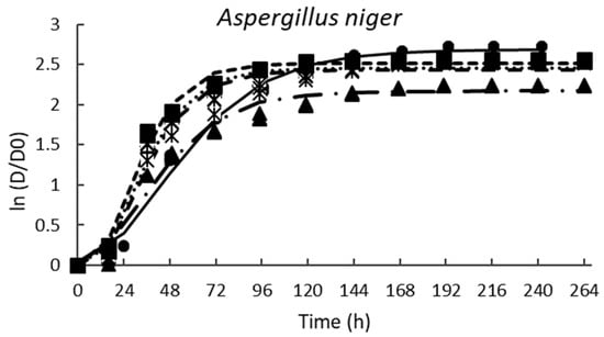 Effect of the different concentrations of pasteurized aqueous extracts (AE) from poolish-type sourdough fermented with Lactiplantibacillus plantarum NRRL B-4496 for 48 h on the growth of the tested molds. Potato-dextrose agar (PDA) control (◾), PDA + 20% AE (♦), PDA + 26% AE (*), PDA + 33% AE (▲), PDA + 50% AE (•), and lines are the predicted values using the modified Gompertz equation.