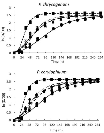 The fungistatic effect of PPD was most effective for P. chrysogenum and P. corylophilum (Figure 4) when 50% was supplemented. P. chrysogenum and P. corylphilum growth rates were delayed by ~24% and 21%, respectively, whereas the lag phase was extended for 24 h and 17 h, respectively. Although CP showed good antimicrobial activity against both Penicillium, the fungistatic effect of CP was lower compared with PPD at 33% for P. chrysogenum and 50% for P. corylophilum.