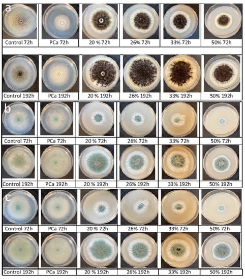 Radial growth of molds treated with different levels of pasteurized aqueous extracts from poolish-type sourdough fermented (48 h) with Lactiplantibacillus plantarum NRRL B-4496 (20, 26, 33, or 50%) or 0.3% calcium propionate (PCa) after 72 and 192 h of incubation at 25 °C. (a) Aspergillus niger, (b) Penicillium chrysogenum, and (c) Penicillium corylophilum.
