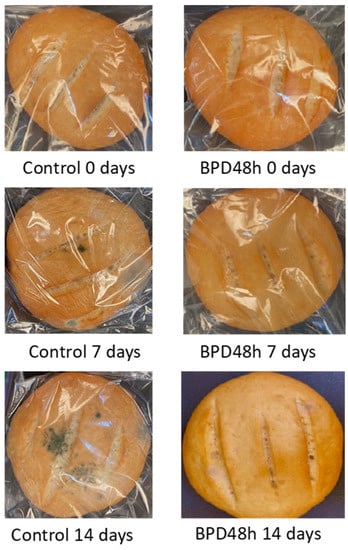 Table 4 presents the mold growth on bread loaves during storage at 25 °C. After 5 d of storage, more than 80% of the control breads showed fungal growth, whereas breads supplemented with PD48h sourdough (BPD48h) were mold-free. In total, 50% of the poolish-type sourdough breads supplemented with Lactiplantibacillus plantarum NRRL B-4496 exhibited mold growth after 10 or 14 d of storage. Figure 6 displays the control pieces of bread and those formulated with poolish-type sourdough during storage. The addition of PD48h sourdough into the bread formulation extended the shelf life by 6 d compared with the control. Similar results were reported by Luz et al. [12] when sourdough fermented with L. plantarum CECT749 added into bread formulation prolonged the bread’s shelf life for at least 2 d.
