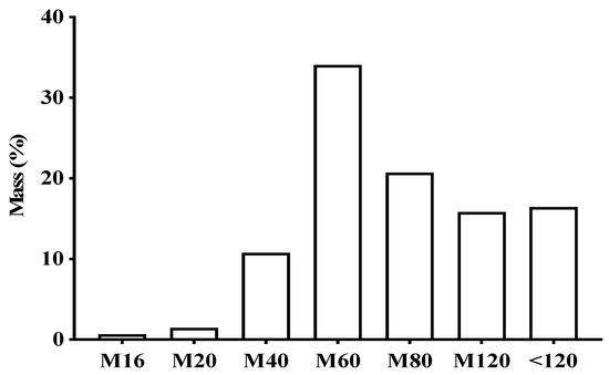 Percentage of different particles sizes in the powder of dry Vismia guianensis leaves after grinding and sifting using different mesh sizes.