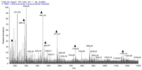 First-order spectrum of direct flow injection analysis (FIA-ESI-IT-MS) obtained in the negative mode for EHVG. (▲) Fragments of the chemical compounds identified.