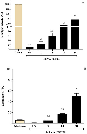Different concentrations of the hydroalcoholic leaf extract of Vismia guianensis (EHVG) showed low toxicity when evaluated by the hemolysis (A) and MTT assay (B). Triton was the positive control for hemolysis (A) and medium was the negative control in the cytotoxic assay. Data represent the mean ± standard deviation of individual samples tested in quadruplicate. (*) p < 0.05 compared to the control; (#) p < 0.05 compared with other concentrations.