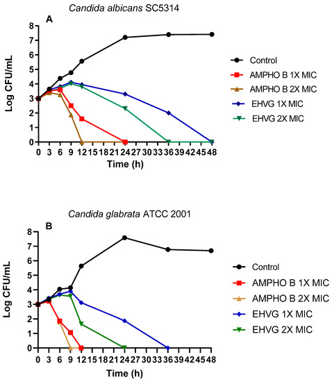 The antifungal activity of EHVG was evaluated by time-kill assays, using the C. albicans (SC5314) and C. glabrata (ATCC 2001) strains. These strains were chosen due to their clinical interest [22,25,26]. EHVG showed a fungicidal effect against both strains, inhibiting all Candida strains over 48 h, especially for C. glabrata after the first 12 h.