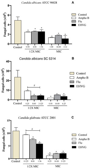 EHVG inhibited the adhesion of Candida albicans ATCC 90,028 (A), C. albicans SC5314 (B), and C. glabrata ATCC 2001 (C) in cultures treated with concentrations of ½ MIC and MIC when compared to untreated samples (control). The EHVG-treated cultures were also compared to those treated with the reference drugs Amphotericin B (Ampho B) or Fluconazole (Flu). (*) p < 0.05 differs from untreated control; (#) p < 0.05 differs from Amphotericin B.