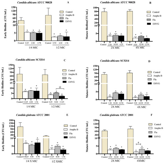 EHVG inhibited the formation of early (A,C,E) and mature (B,D,F) biofilms. The CFU/mL values were established in cultures of Candida albicans (ATCC 90028, A,B; SC5314, C,D) and C. glabrata (ATCC 2001, E,F) after 48 h and 72 h. The samples treated with different concentrations of EHVG (1/4 and 1/2× MIC for early biofilms, and 2× and 4× MIC for mature biofilms) were compared to cultures treated with Amphotericin B (Ampho B) or fluconazole (Flu), and with the untreated control. (*) p < 0.05 in comparison to control; (@) in comparison to Fluconazole, and (&) p < 0.05 Fluconazole compared to Amphotericin B.
