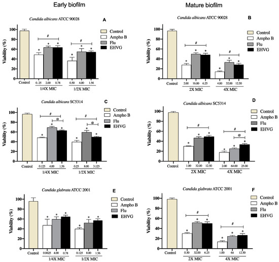 Percentage of inhibition on EHVG-treated early (A,C,E) and mature biofilms (B,D,F) of Candida albicans ATCC 90,028 (A,B), C. albicans SC5314 (C,D) and C. glabrata ATCC 2001 (E,F) after 48 and 72 h, evaluated by MTT assay. Samples were treated with EHVG (1/4 and 1/2 for early biofilms, and 2× and 4× MIC for mature biofilms) and compared to untreated controls or the reference drugs Amphotericin B (Ampho B) and Fluconazole (Flu). (*) p < 0.05 compared to control. (#) p < 0.05 compared to Amphotericin B and (@) p <0.05 compared to fluconazole.
