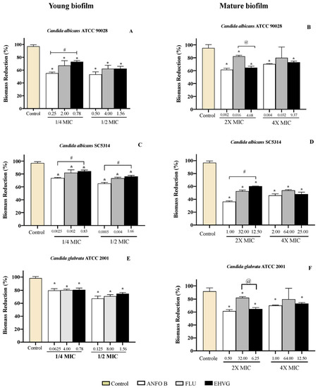 Reductions in biofilm biomass stained with crystal violet (CV) of Candida spp. (ATCC 90028, A,B), (ATCC 2001, C,D) and (SC5314, E,F) after 48 and 72 h. The samples were treated with EHVG and compared to untreated controls or to the reference drugs Amphotericin B (AMHO B) and Fluconazole (FLU). (*) p < 0.05 differs from control; (#) p < 0.05 differs from Amphotericin B and (@) p <0.05 compared to fluconazole.