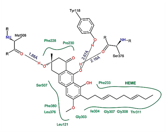 Intermolecular interactions, such as hydrogen bonds with amino acid residues (Tyr-118, Ser-378 and Met-508), hydrophobic interactions, and interactions with the heme group, confer the ability to stabilize a given ligand at the binding site, forming ligand-receptor complexes. In the present study, vismione D was predicted to interact with practically the same amino acids as posaconazole, a commercially available fungicide, but more spontaneously and with a greater interaction potential. In addition, the spatial conformation obtained indicated a more linear structure of vismione D contributing to the molecular interactions.