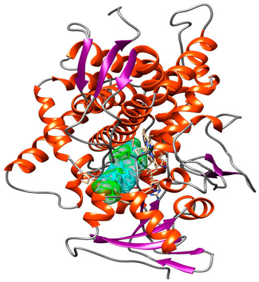 Figure 12 shows the spatial conformation obtained for the molecular docking analysis of vismione D and CaCYP51 structures. Several binding sites could be observed, which favor a possible action of the compound on the enzyme.