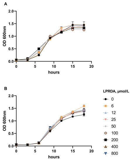 Two S. aureus strains were used in this study: the methicillin-susceptible S. aureus ATCC 29213 (MSSA) strain and the methicillin-resistant S. aureus ATCC 43300 (MRSA) strain. Both strains were grown in the presence of LPRDA at concentrations ranging from 6 µmol/L to 800 µmol/L. We did not detect any obvious bactericidal effect of LPRDA compared to the control studies (Figure 1).