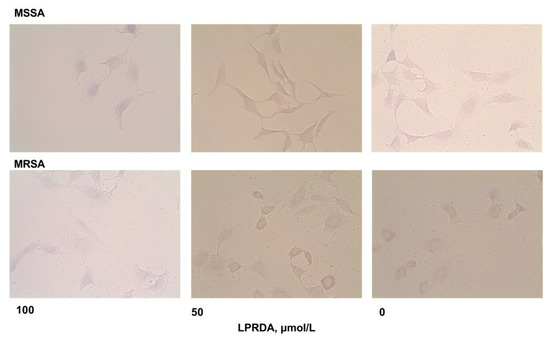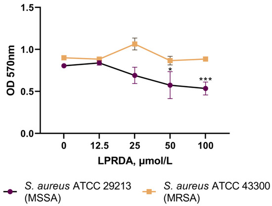 The S. aureus ATCC 29213 (MSSA) strain incubated with LPRDA demonstrated a 10–44% reduction in biofilm formation compared to the untreated MSSA bacteria (Figure 4). LPRDA did not affect the biofilm formation process substantially in the case of the S. aureus ATCC 43300 (MRSA) strain, with a maximum decrease of 12% at 100 µmol/L LPRDA concentration (Figure 4).