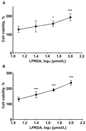 Viability of Vero cells after 72 h of incubation with LPRDA. Initial cell seeding concentration (A) 2000 cells/well and (B) 1000 cells/well. Dots represent LPRDA concentrations (12.5, 25, 50, and 100 µmol/L). * p < 0.05; *** p < 0.01.